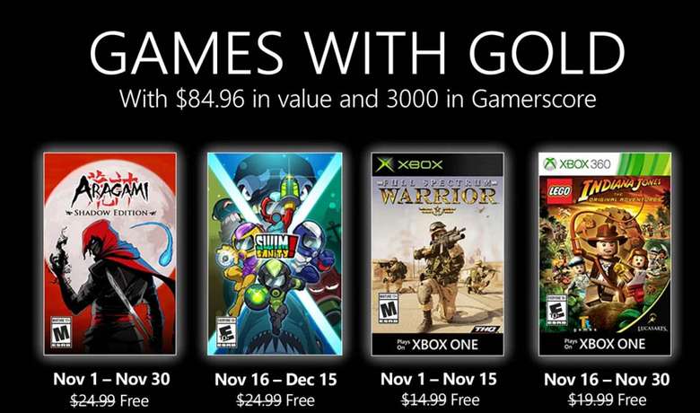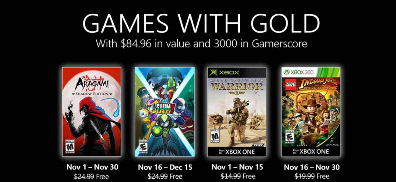 Para comenzar, entre el 1 y 30 de noviembre podremos conseguir Aragami: Shadow Edition, un juego de sigilo en tercera persona en el que te conviertes en un asesino no muerto con el poder de controlar las sombras. Después, podrás obtener Swimsanity! a partir del 16 de noviembre y hasta el 15 de diciembre, este es un juego de disparos multijugador subacuático, con modos de juego competitivos y cooperativos repletos de acción, todos ellos disponibles para jugar en línea o en local. Ambos títulos están disponibles en Xbox One.