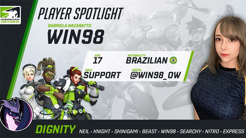 A jogadora brasileira Gabriela “Win98” Nacaratto, que recentemente se sagrou campeã da Overwatch Contenders South America, foi destaque na Overwatch League na última semana. Juntamente com a sua equipe – Dignity – Gabriela conquistou uma importante marca, além do título de campeã da segunda semana do principal torneio de Overwatch da região. Ela é a primeira jogadora a se sagrar campeã em uma competição oficial da modalidade.