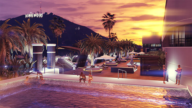 Renove sua residência com diversas plantas baixas melhoráveis, incluindo um spa particular com estilista pessoal 24 horas, uma área de bar e festas perfeita para hospedar festas de membros insanas e com fliperamas retrôs particulares, e um espaço multimídia para curtir partidas de Don't Cross the Line e o cinema contemporâneo de Vinewood, como O Colapso e O Robô mais Solitário da Grã-Bretanha.