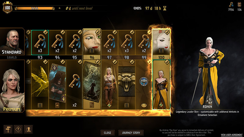 Além do nível básico da Jornada, que é gratuito para todos os jogadores, o Passe Premium também retorna para a segunda temporada, concedendo acesso instantâneo ao visual de líder lendário e personalizável de Ciri. O Passe Premium inclui mais recompensas, como barris de cartas, títulos, bordas, cartas animadas e avatares.