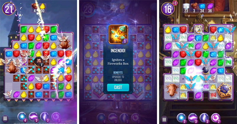 Em Harry Potter: Puzzles & Spells, os jogadores entram em uma aventura match-3 (combinação tripla), a combinação de três elementos iguais - repleta de feitiços, humor, cores e personagens da série Harry Potter. Com a trilha sonora original da saga Harry Potter, os fãs revisitam de forma autêntica em dispositivos móveis a jornada de Harry pelo Mundo Mágico.