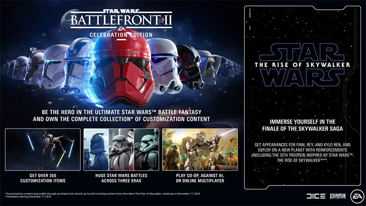 Em um lançamento conjunto ad DIEC com a Lucasfilm, chegou nesta semana Star Wars Battlefront II: Celebration Edition em edições para PC, PlayStation 4 e Xbox One. E não para pro aí: no final deste mês, Star Wars Battlefront II celebrará o lançamento de Star Wars: Episódio IX – A Ascensão Skywalker com uma atualização de conteúdo baseada no filme, a partir de 17 de dezembro.