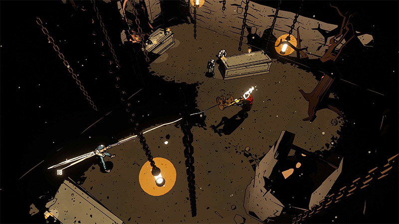 Com ângulos muito destacados, o design artístico do título abusa da presença de sombras em grande parte dos ambientes, que sempre são marcadas com tons frios e “lavados”, criando uma composição muito bonita e sombria, que parece ter saído de uma HQ de terror. O mesmo acontece com seu protagonista, que tem um visual que claramente é inspirado no Motoqueiro Fantasma. Essa equipe de criação deste jogo é muito fã de quadrinhos!
